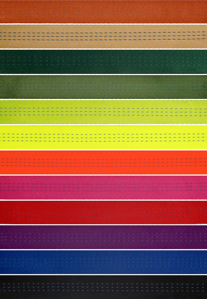 100 Yard Lengths in Rust, Tan, Green, Kiwi, Lime Punch, Fluorescent Yellow, Orange, Raspberry, Red, Purple, Blue, and Black